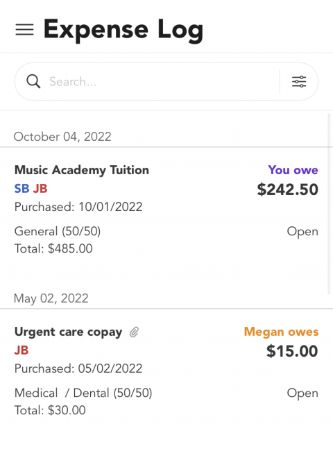 Expenses can also be filtered by date, category, children, status, and owes/paid. To filter expenses, click on the toggle icon next to the search bar and then select what you’d like to filter for. Once you’ve selected your filer, click “Apply”.